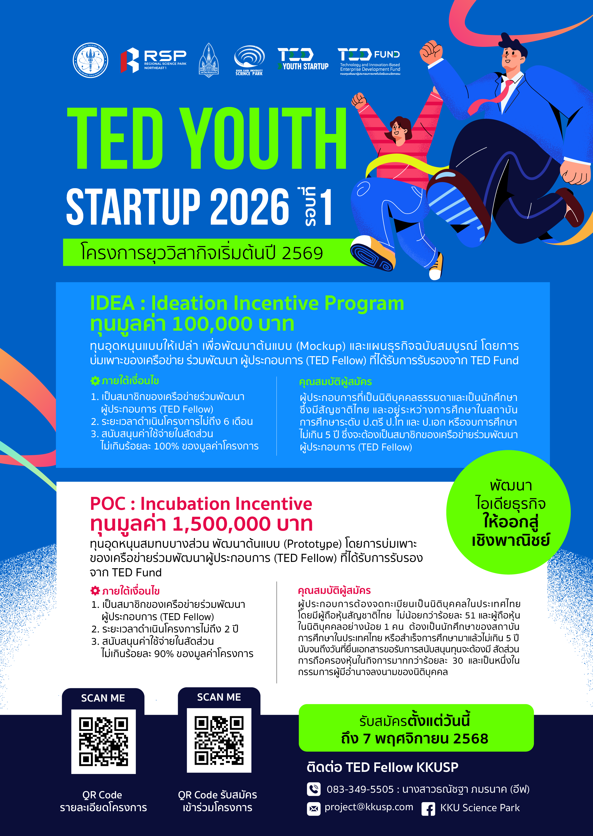 ขอเชิญชวน นักศึกษา ผู้ที่กำลังศึกษาอยู่ ป.ตรี โท และ เอก และผู้ที่จบไม่เกิน 5 ปี เข้าร่วม “โครงการยุววิสาหกิจเริ่มต้น ประจำปี 2569