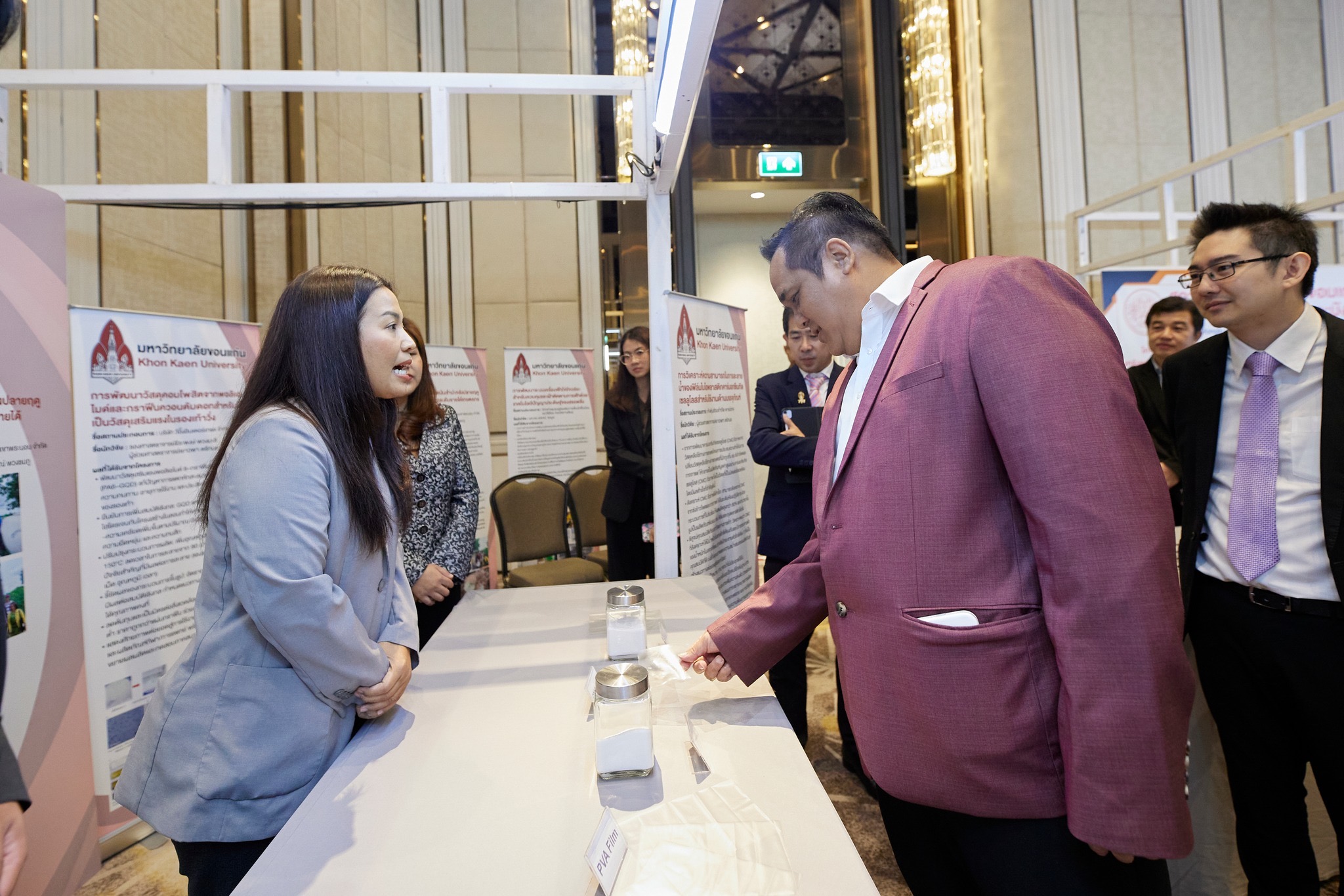 ในการนี้ ผู้ช่วยศาสตราจารย์เยาวภา ตรีกมล นักวิจัยในโครงการ “การพัฒนาวัสดุคอมโพสิตจากพอลิเอไมด์และกราฟีนควอนตัมดอท สำหรับใช้เป็นวัสดุเสริมแรงในรองเท้าวิ่ง” และ โครงการ “การวิเคราะห์ความสามารถในการละลายน้ำของฟิล์มไบโอพลาสติกคาร์บอกซีเมทิลเซลลูโลส สำหรับบรรจุภัณฑ์” พร้อมนักศึกษา Posdoc ระดับปริญญาเอก จากคณะวิทยาศาสตร์ มหาวิทยาลัยขอนแก่น เข้าร่วมนำเสนอผลงาน อีกทั้งนางสาวพิชชาญา ไกรสกุล ผู้ช่วยผู้จัดการแผนกประสานงานความร่วมมืออุตสาหกรรม และนางสาววริศรา จันละบุตร นักประสานงานความร่วมมืออุตสาหกรรม จากอุทยานวิทยาศาสตร์ มหาวิทยาลัยขอนแก่น เข้าร่วมออกบูธนำเสนอผลงานโครงการ