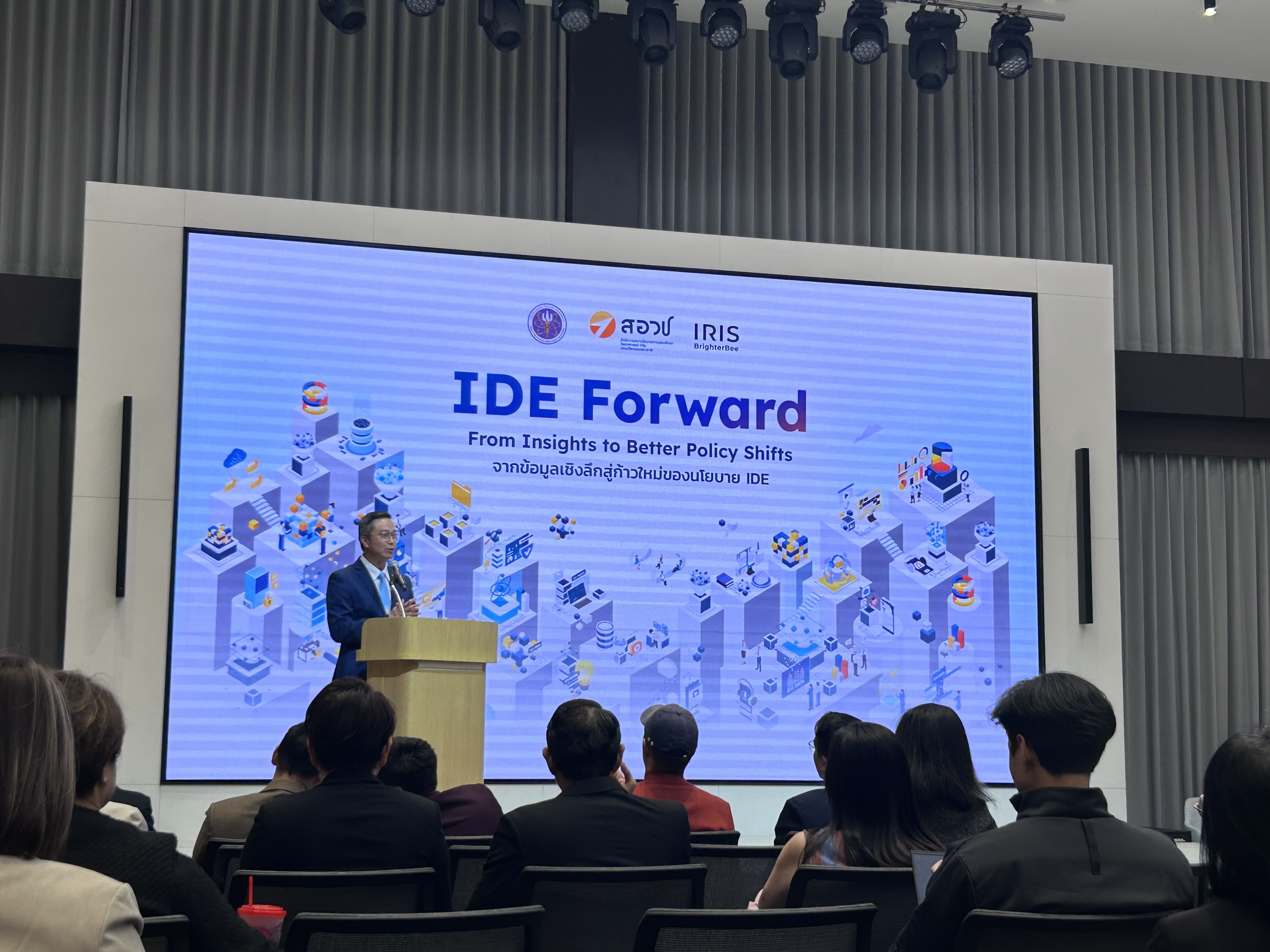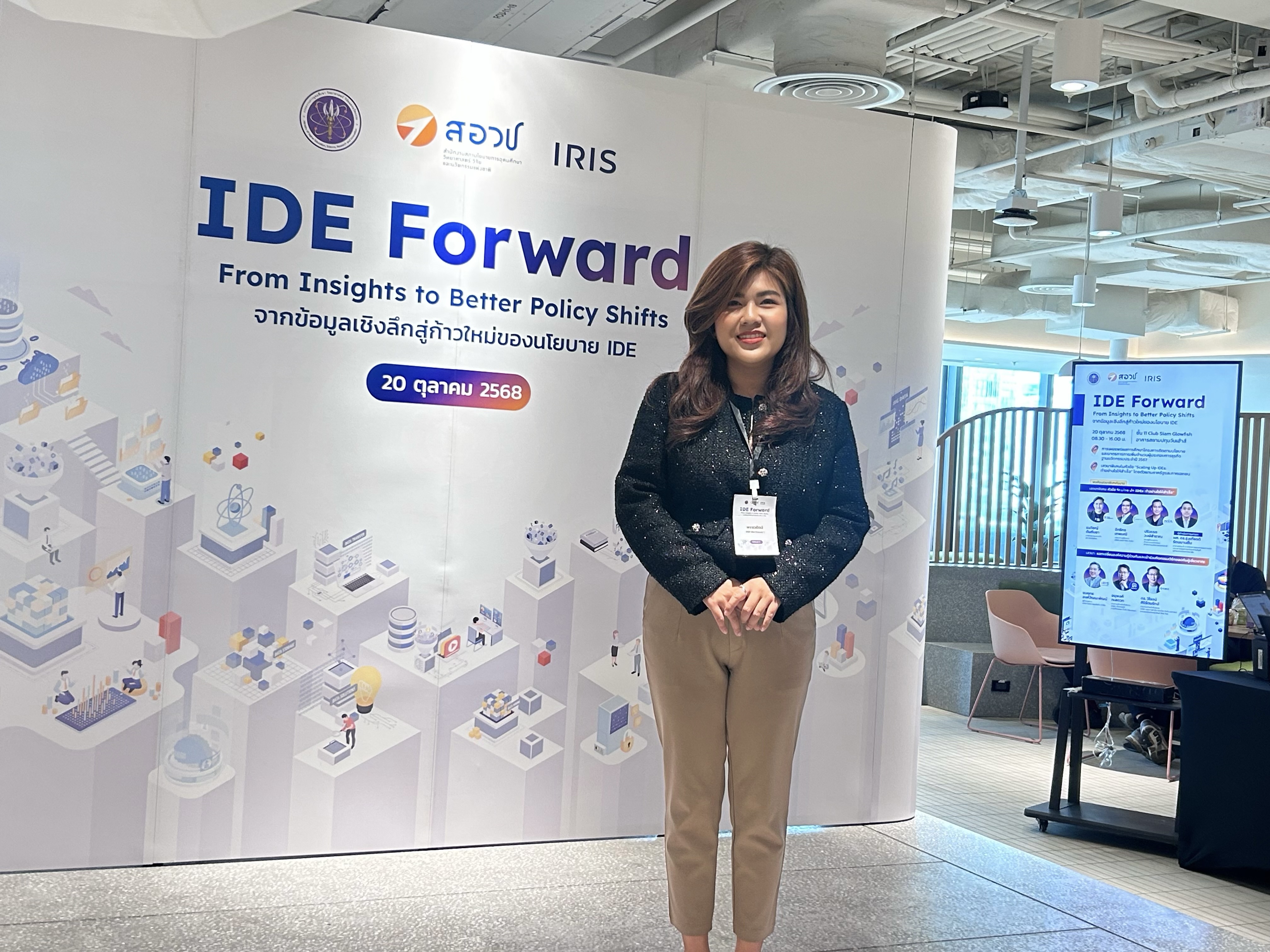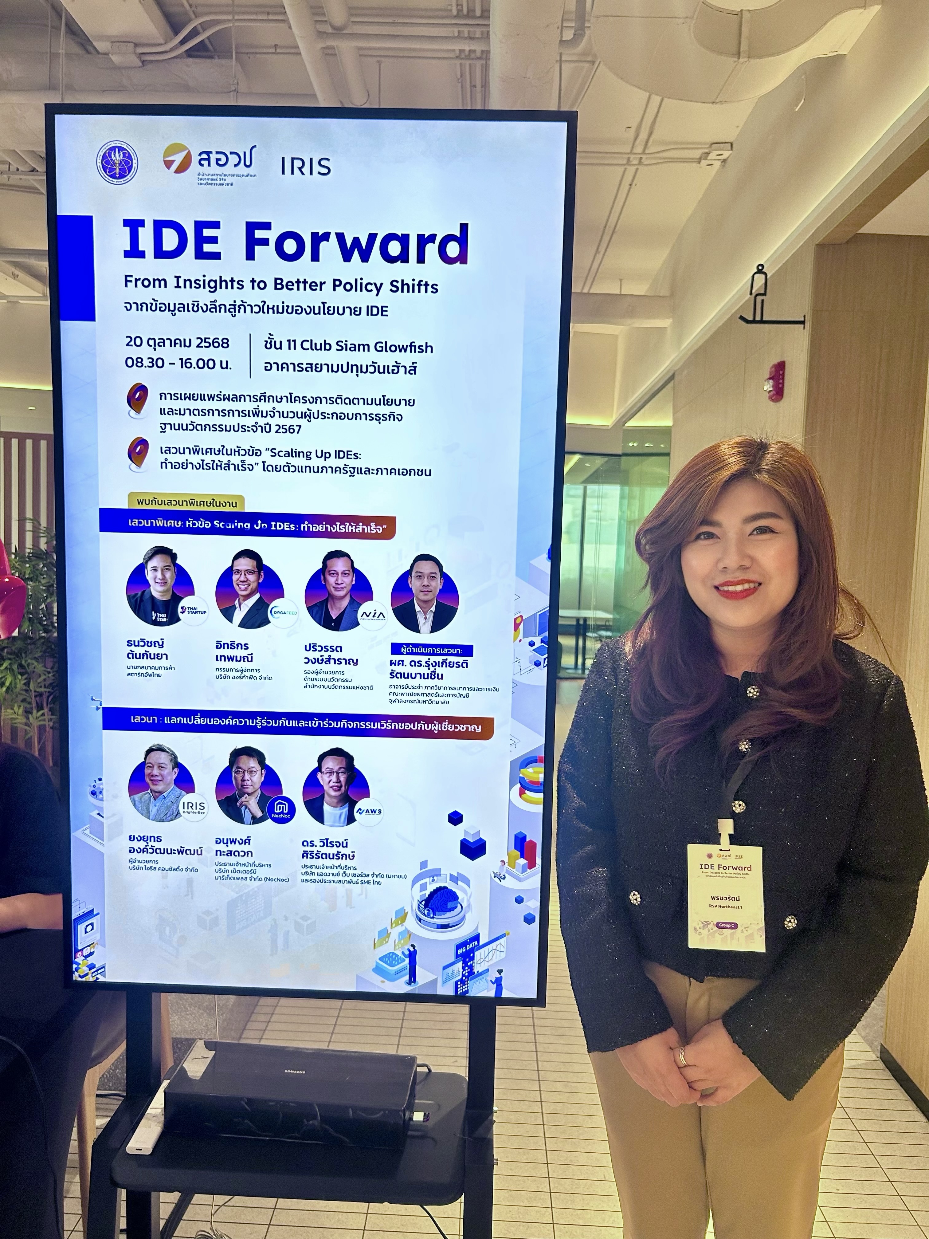 เมื่อวันที่ 20 ตุลาคม 2568 ที่ผ่านมา อุทยานวิทยาศาสตร์ภูมิภาค ภาคตะวันออกเฉียงเหนือ 1 (Regional Science Park Northeast 1: RSP Northeast 1) โดย ดร.อภิรชัย วงษ์ศรีวรพล ผู้อำนวยการอุทยานวิทยาศาสตร์ภูมิภาค ภาคตะวันออกเฉียงเหนือ 1 และผู้อำนวยการอุทยานวิทยาศาสตร์ มหาวิทยาลัยขอนแก่น ได้มอบหมายให้ นางสาวพรชวรัตน์ ฐานมั่น ผู้จัดการแผนกประสานงานความร่วมมืออุตสาหกรรม เข้าร่วมงานสัมมนา “IDE Forward: From Insights to Better Policy Shifts – จากข้อมูลเชิงลึกสู่ก้าวใหม่ของนโยบาย IDE” จัดโดย สำนักงานสภา นโยบายการอุดมศึกษา วิทยาศาสตร์ วิจัยและนวัตกรรมแห่งชาติ (สอวช.) ร่วมกับ บริษัท ไอริส คอนซัลติ้ง จำกัด ณ ชั้น 11 Club Siam Glowfish อาคารสยามปทุมวันเฮ้าส์ กรุงเทพมหานคร
