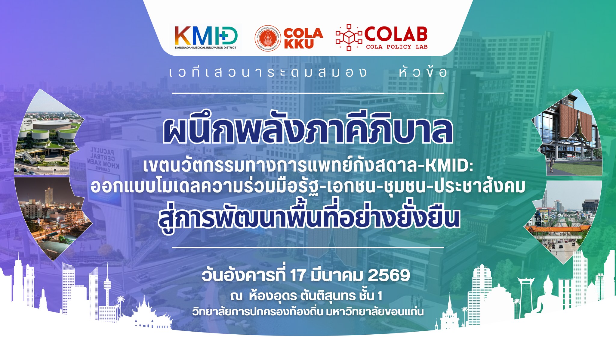วันที่ 17 มีนาคม 2569 อุทยานวิทยาศาสตร์ มหาวิทยาลัยขอนแก่น โดย ดร.อภิรชัย วงษ์ศรีวรพล ผู้อำนวยการ เข้าร่วมการประชุมปรึกษาหารือออกแบบความร่วมมือในการพัฒนาอย่างยั่งยืน ระหว่างภาครัฐ ภาคเอกชน ชุมชน และประชาสังคม เพื่อขับเคลื่อนโครงการเขตนวัตกรรมทางการแพทย์กังสดาล (Kangsadal Medical Innovation District: KMID) จัดโดยศูนย์บริหารเวลเนสและเขตนวัตกรรมทางการแพทย์ มหาวิทยาลัยขอนแก่น ร่วมกับวิทยาลัยการ ปกครองท้องถิ่น มหาวิทยาลัยขอนแก่น ซึ่งมีผู้บริหาร คณาจารย์ และผู้แทนจากหน่วยงานภายในมหาวิทยาลัยขอนแก่น และภาคีเครือข่ายที่เกี่ยวข้องเข้าร่วม เพื่อแลกเปลี่ยนความคิดเห็น ระดมข้อเสนอเชิงนโยบาย และร่วมกันออกแบบโมเดลความร่วมมือของภาคีเครือข่ายที่เกี่ยวข้อง เพื่อพัฒนาโครงสร้างการบริหารจัดการพื้นที่ (Area-based Governance Model) ของเขต นวัตกรรมทางการแพทย์กังสดาลให้มีความชัดเจน สามารถขับเคลื่อนการพัฒนาพื้นที่ได้อย่างมีทิศทาง ณ ห้องประชุมอุดรตันติสุนทร วิทยาลัยการปกครองท้องถิ่น มหาวิทยาลัยขอนแก่น