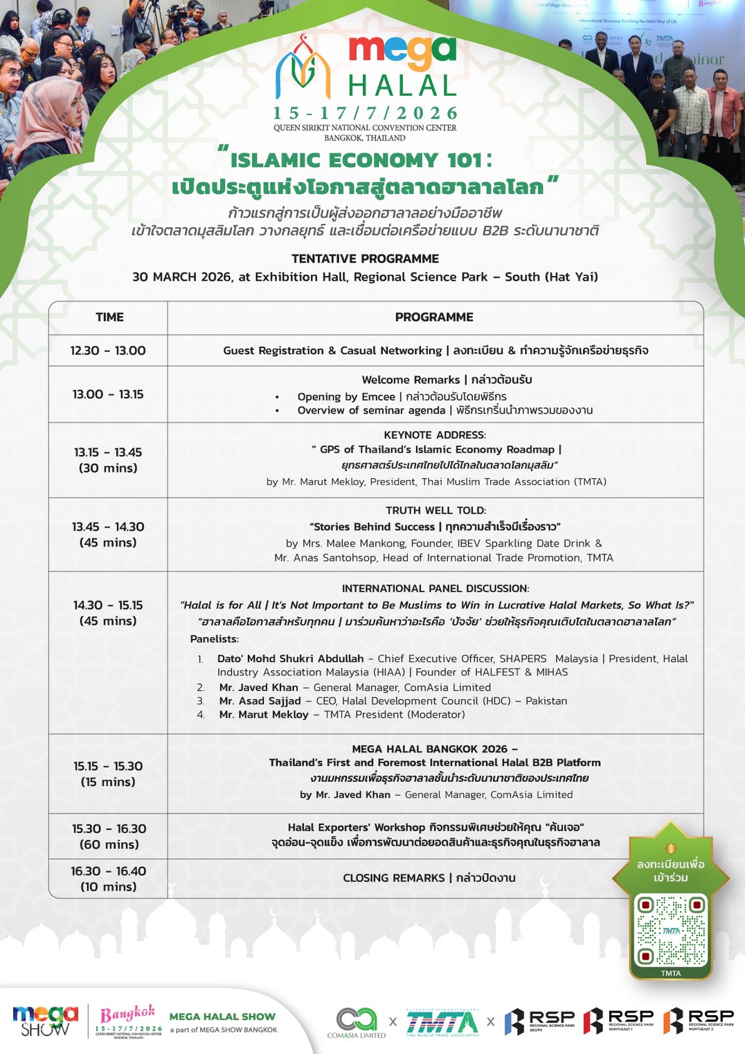 สำหรับผู้ประกอบการทุกระดับที่ต้องการยกระดับผลิตภัณฑ์/สินค้าก้าวสู่ตลาดมุสลิมโลก ทั้งผู้เริ่มต้นมือใหม่และผู้ที่มีประสบการณ์ มาเรียนรู้ สร้างเครือข่ายคู่ค้าระดับนานาชาติ ภายในงานจะพบทีมวิทยากรและผู้เชี่ยวชาญมากมาย ทั้งด้านมาตรฐานนวัตกรรม ด้านกลยุทธ์การตลาด และด้านสิทธิประโยชน์จากทางภาครัฐและหน่วยงานสนับสนุน ในการขยายตลาดต่างประเทศ
